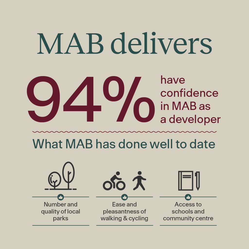 We’re pleased to see 94% of residents surveyed have confidence in MAB as ‘the developer’, underpinned by our commitment to the early delivery of community amenity, infrastructure and service. The top three reasons people love living at Merrifield include access to parks and open spaces, major road networks and shops.